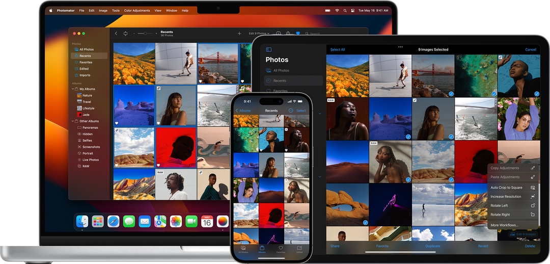 通过iCloud自动在所有苹果设备(Mac、iPhone、iPad)间同步整个照片库及全部编辑历史。