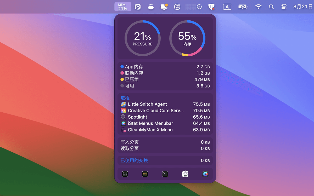 详尽的内存洞察:以饼图、条形图或百分比等多种形式显示内存使用、压力与交换情况,并列出消耗内存最多的应用程序。