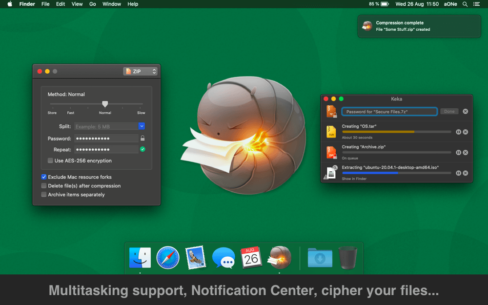 软件的设计充分体现了便捷性。您只需将 Keka 图标保留在程序坞中,无需启动软件,即可直接将需要压缩的文件或文件夹拖拽至图标上,快速完成压缩操作。这种无缝的拖拽体验,极大提升了日常工作效率。
